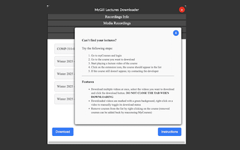 McLecture هو ملحق مجاني لمتصفح Google Chrome مصمم لطلاب جامعة McGill، مما يمكّنهم من تنزيل تسجيلات المحاضرات بسهولة من منصة myCourses. يعمل هذا الأداة على تبسيط عملية الوصول إلى مواد الدورة من خلال السماح للمستخدمين باختيار وتنزيل مقاطع الفيديو المتعددة في وقت واحد. مع ميزات مثل تتبع حالة التنزيل والتبديل اليدوي للتنزيلات، فإنه يوفر تجربة سهلة الاستخدام لإدارة موارد المحاضرات.